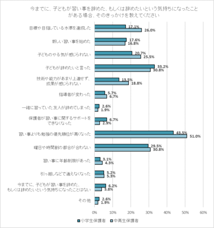 最も多かったのは、「習い事よりも勉強の優先順位が高くなった」で、小学生保護者の43.5%、中高生保護者の51.0%だった。また、約3人に1人が、「子どもが辞めたいと言った」「曜日や時間の都合が合わない」ことを、習い事を辞めるきっかけに挙げていた。
