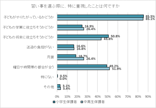 最も多くの保護者が重視したのは、「子どもがやりたがっているかどうか」で、約85%にのぼった。