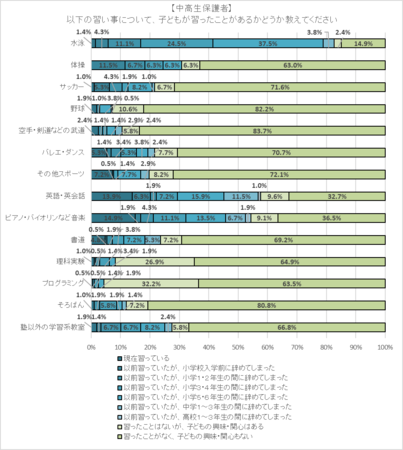 小学生保護者・中高生保護者とも、習ったことがある習い事で多かったものは、「水泳」「英語・英会話」「ピアノ・バイオリンなど音楽」で、過半数の子どもが経験者だった。特に、「水泳」は小学生の75.6%、中高生の82.7%が経験していることが分かった。また、「習ったことはないが、子どもの興味・関心はある」割合が高かった習い事は、小学生保護者・中高生保護者とも、「理科実験」「プログラミング」だった。
