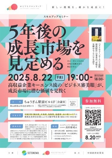 株式会社せとのわ(岡山市北区本町、代表取締役 太田 実)は8月22日(金)、中国地方5県の地域未来牽引企業※や中堅企業を対象とした、ビジネスセミナー「5年後の成長市場を見定める」を岡山市北区本町のちゅうぎん駅前ビル会議室で開催いたします。