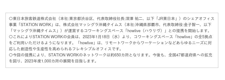 STATION WORKは、2019年8月にサービスを開始したJR東日本のシェアオフィス事業です。個室ブースSTATION BOOTHや、ホテルシェアオフィスを始めとするワークプレイスを提供することで、多様化する働き方をサポートし、ソリューションを提案していきます。今回のマッシグラ沖縄タイムスとの提携により、日本全国約650カ所のネットワークとなります。2023年度1,000カ所体制に向けて、今後も拠点拡大を進めます。