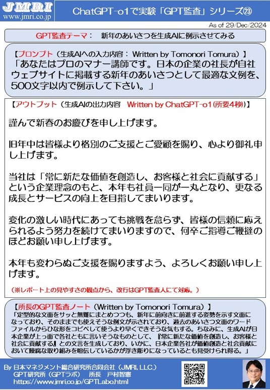 そこで、GPT監査レポート第23号では、ChatGPT「o1」で新年のご挨拶文面を出力させて考察してみました。