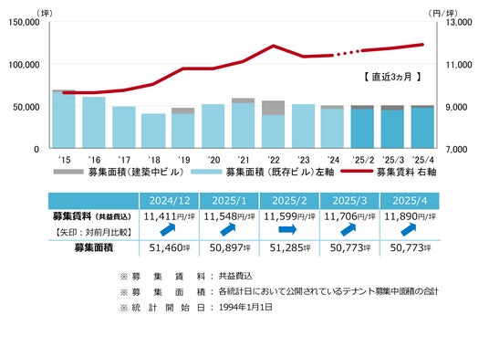 募集賃料は前月比プラス184円/坪の11,890円/坪と、6ヵ月連続の上昇となった。募集条件を見直す動きは一部で見られるが、引き続き限定的な水準に止まっている。
