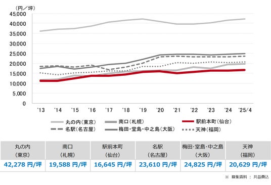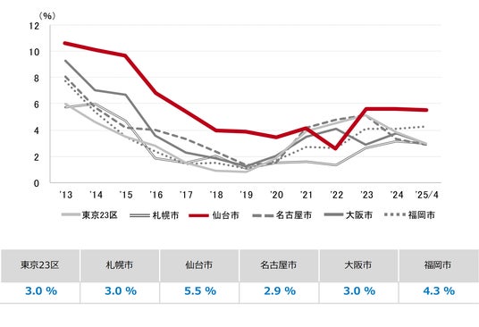 三幸エステート株式会社(本社:東京都中央区、取締役社長:武井重夫)は、2025年4月度の仙台市オフィス賃貸状況(空室率&現空面積:全規模、募集賃料&募集面積:全規模、規模別空室率、主要エリア※1空室率:全規模)および全国6大都市(東京・札幌・仙台・名古屋・大阪・福岡)の大規模ビルのマーケットデータをまとめた「オフィスマーケット2025年5月号仙台」を公表します。