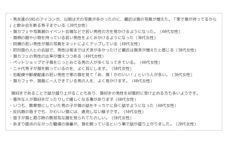 そして、最近若い女性向けの雑誌等で取り上げられることが多い「猫好き男子」に関しても、アンケートではその姿が浮き彫りになりました。