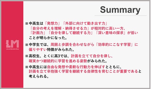 ・中学生・高校生ともに右脳的な発想力が最も高く、左脳的な計画力が最も低い傾向であった。また、外向的な力が高く内向的な力が低い傾向があり、動き出す力は高い一方で自分を律してやり抜く力は低い傾向がみられた。