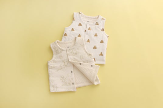 オーガニックコットンのリバーシブルタイプのベスト。シンプルにも、柄コーデにもかわいく仕上げられます。
