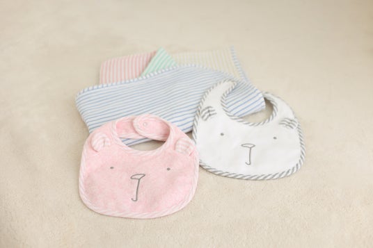 くま耳と顔の刺しゅうが施されたスタイ。使い勝手がよいパステルカラーのおくるみには、デザイン違いのシンプルなブルーとピンクの単色も展開。