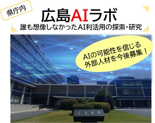 AIのポテンシャルを十二分に引き出し、地域課題の解決と付加価値を創出することを目指し、県庁内に「広島AIラボ」を設置。県職員と外部人材が専属的に自らテーマを設定し、新しい価値を生み出すようなAIの活用に向けて自由に探索・研究を行う。