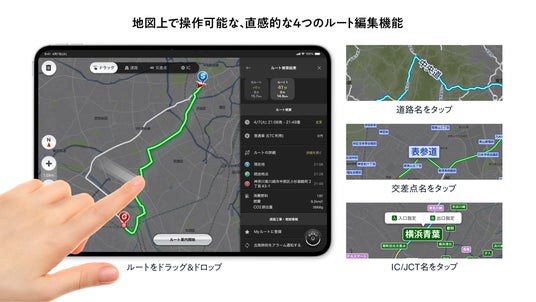 乗り降りするICを変更したいトラックドライバーや、乗客から交差点や道路の指定をされることの多いタクシードライバーが、走行前に地図で位置関係を見ながら即座にルート編集できるようにすることで、安全運転と業務効率化をサポートします。