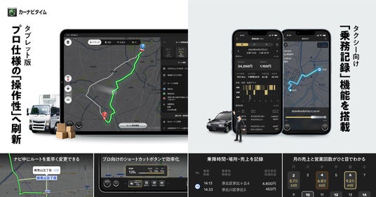 株式会社ナビタイムジャパン(代表取締役社長:大西 啓介、本社:東京都港区)は、2026年4月17日(金)より、カーナビアプリ『カーナビタイム』タブレット版のUIを、大幅に刷新いたします。これに合わせ、プロドライバー向けに、業務別の「ショートカットボタン」およびタクシードライバー向けの「乗務記録」機能も新たに提供開始いたします。