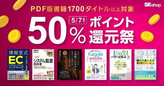 SEshopは、IT書・ビジネス書をはじめ、資格書や実用書まで幅広いラインナップを展開する翔泳社の公式通販サイトです。5月7日(水) まで、PDF版の対象書籍を購入すると、本体価格の50%をポイント還元するキャンペーンを開催します。貯まったポイントは1ポイント=1円として次回のお買い物から使えます。新刊含む1700点以上のタイトルが対象となります。