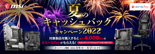 この度、エムエスアイコンピュータージャパン株式会社は、8月8日(月)から8月21日(日)までの期間で、対象のMSI製品を購入すると最大4,000円分の“えらべるPay”が貰える「夏のキャッシュバックキャンペーン2022」を開催します。