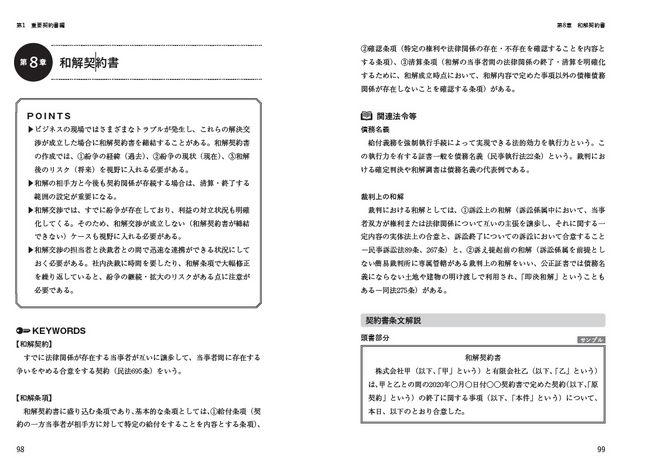 本書では、代表的な契約書ごとに「契約締結のポイント」「重要キーワード」「契約書の条項解説」等を重点的に解説し、契約書の基礎を身に着けられる一冊です。また、「起こりがちな紛争」を事例とし、リスクヘッジのための契約書の書き方や、弁護士への相談の勘所も解説しています。