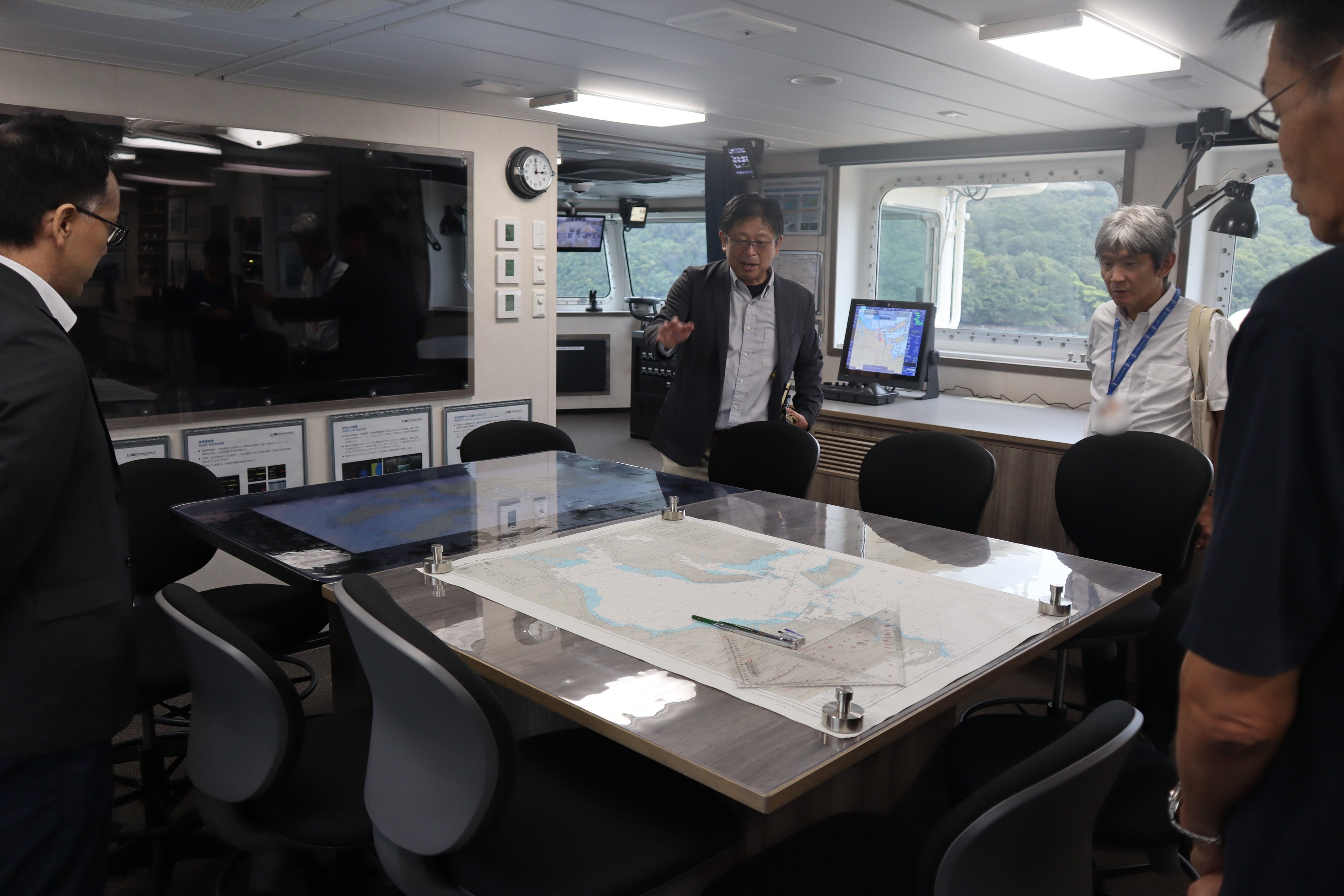 齊心船長(真ん中)が船内の設備等を紹介する様子