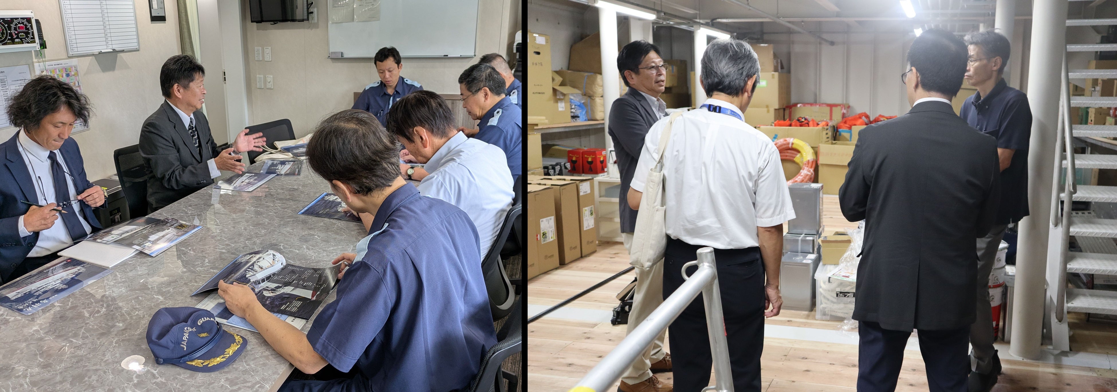 鳥羽海上保安部および県議との意見交換の様子(左)、三重県防災対策部による視察の様子(右)