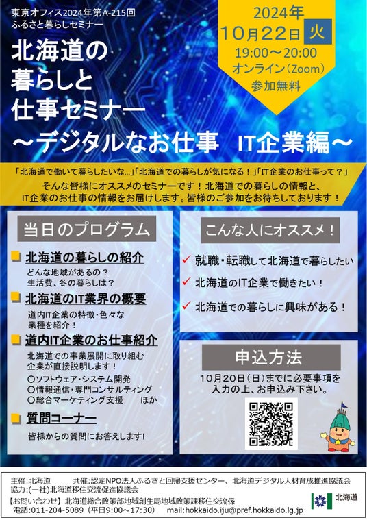 今回、北海道の暮らしに関心があり、「IT企業のお仕事が気になる」「北海道のIT業界について知りたい」という方に向けて、北海道のIT企業の仕事をテーマとしたオンラインセミナーを開催します。