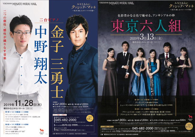 みなとみらいクラシック・マチネ~名手と楽しむヨコハマの午後~◆11/28「二台ピアノ《金子三勇士&中野翔太》」、2020年3/13「管楽器5人とピアノ《東京六人組》」