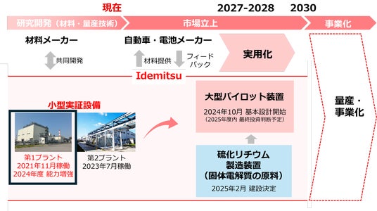 この能力増強によって、固体電解質のサンプル生産能力を現行の年間数トンから十数トン規模に拡大しました。また、量産技術開発のための設備も増強しました。次のステージとなる大型パイロット装置での量産技術の確立に向けた技術検証を加速し、2027~28年の全固体電池の実用化、その先の固体電解質の事業化を目指します。