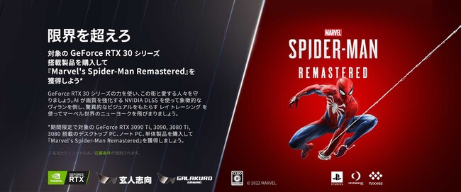 期間中、玄人志向 / GALAKURO GAMINGの指定グラフィックボードをご購入いただき、お申込みいただきますと、人気ヒーロー・スパイダーマンを題材にしたオープンワールドゲーム「Marvel's Spider-Man Remastered」のPCデジタルダウンロード版がもらえるキャンペーンを開催します。