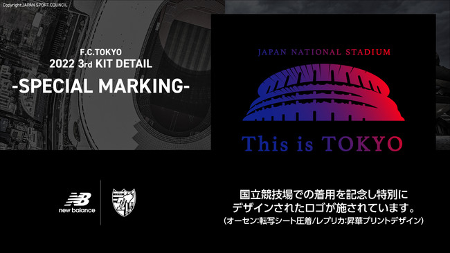 また今回は、国立競技場での着用を記念し、「JAPAN NATIONAL STADIUM」の文字と国立競技場をクラブカラーである青赤のグラデーションで表現。国立競技場は首都東京にあり、そしてその地でファン・サポーターとクラブが共に歩んできた歴史、大切な想いを「This is TOKYO」の文字に込めて、この特別な国立デザインを3rdユニフォームにデザインしました。