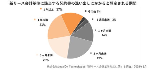 新リース会計基準の対応においては、新リース会計基準の適用対象となり得る締結済み契約書の洗い出しが必要不可欠です。LegalOn Technologiesが2025年1月に行った「新リース会計基準対応に関する調査」では、契約書の洗い出しにかかる期間として「3ヶ月以上必要」と答えた方が全体の半数以上、という結果も出ており、膨大な締結済み契約書の中からのリース契約を洗い出すことが手間だと感じる割合が高くなっています。