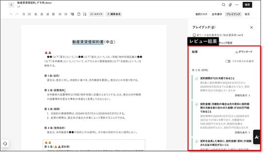 また、「LegalOn Cloud」の契約リスクチェック機能には、新リース会計基準の適用対象となり得る契約書の類型に対して注意点を表示する「実務対応アラート」を実装しています。