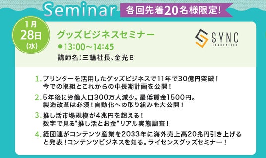 1/28には、ライセンスグッズセミナーを開催!ミマキエンジニアリング製プリンタを駆使した人気グッズビジネスや実績をご紹介