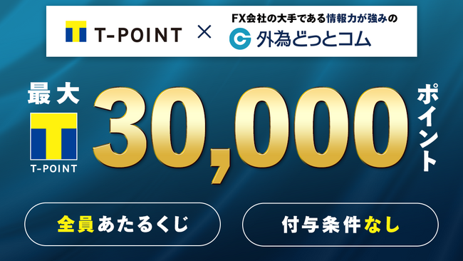 株式会社外為どっとコム(本社:東京都港区、代表取締役社長:竹内 淳)は、2024年3月25日(月)よりCCCMKホールディングス株式会社(本社:東京都渋谷区、代表取締役社長 兼 CEO:高橋 誉則)が提供するTサイト[Tポイント/Tカード]の「Tくじ」にて、最大Tポイント30,000ポイントがあたる「Tくじ×外為どっとコム 全員あたるくじ!」キャンペーンを実施いたします。くじ引き実施後には、手軽に申込みできるお得な口座開設キャンペーンもご紹介します。