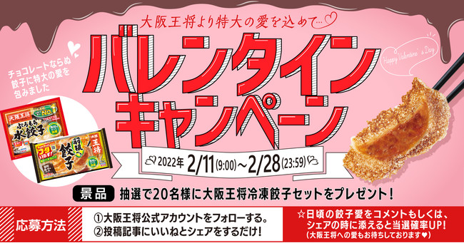 株式会社イートアンドフーズ(東京ヘッドオフィス:東京都品川区 代表取締役社長:仲田浩康)は、大阪王将公式TwitterおよびInstagramで応募できる『大阪王将より特大の愛を込めて…バレンタインキャンペーン』を2022年2月11日(金)より開催いたします。