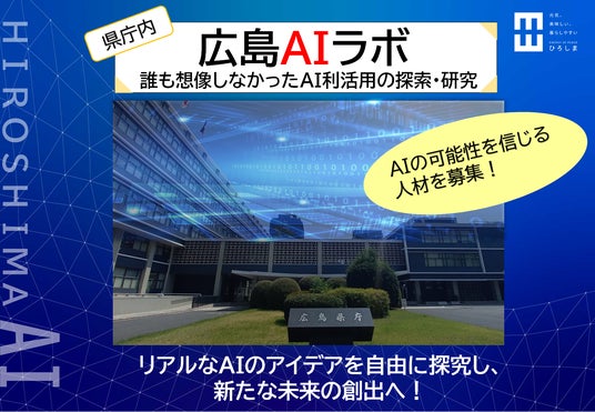 広島県では、AIのポテンシャルを十二分に引き出し、地域課題の解決と付加価値を創出することを目指して、県庁内に「広島AIラボ」を設置し、新しい価値を生み出すようなAIの活用に向けて自由に探索・研究を行う活動を開始しています。
