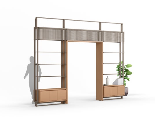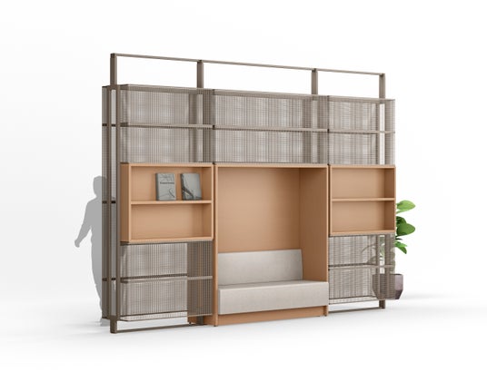 支柱間に様々なアイテムを取り付けられる構造により、場を仕切りつつもコミュニケーションの場と収納機能を兼ね備えることができます。プライバシーを守りながらも、周囲とのつながりも自然に感じられる“心地よい境界線”を、透ける素材と抜けのある構成で実現しました。