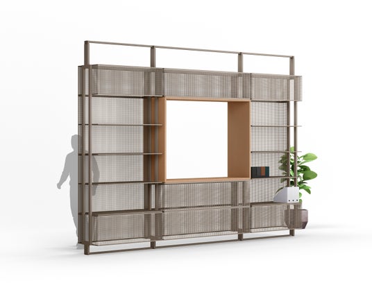 パンチングメタルの重なりが織りなす陰影は、空間に繊細な美しさと奥行きを与えつつ、天井付近まで高さがある構造が視覚的なインパクトを生み出します。支柱を内側にインセットすることで、全体としてすっきりした抜け感ある印象を実現しました。12mmのスチール棚は補強がなく裏面まで美しい、洗練されたミニマルな形を追求しました。突板仕上げの木製家具は、自然素材ならではの風合いが温もりと上質さをもたらします。各アイテムのエッジに持たせた丸みが、空間全体に柔らかさと親しみやすさを加え、オフィスワーカーが自然と集まりたくなるような雰囲気を演出します。