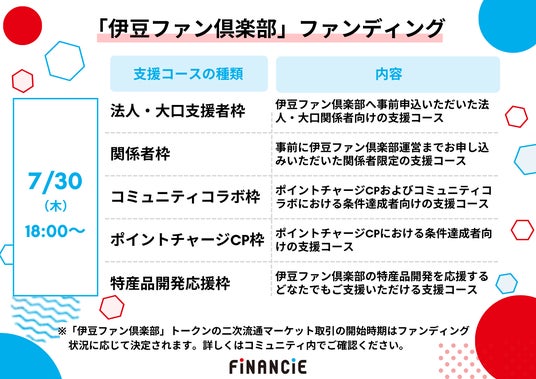 本日7月30日(水)18:00より、FiNANCiEアプリ内の伊豆ファン倶楽部コミュニティにて、支援コースを販売開始しました。