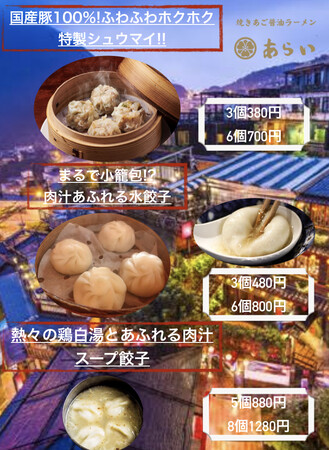 シュウマイ、水餃子、スープ餃子を新メニューとしてご用意いたしました。