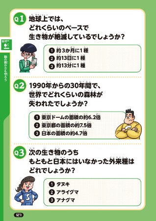 全51問(各目標3問)のクイズを収録。例えば、「地球上では、どれくらいのペースで生き物が絶滅しているでしょうか?」といった、おどろきのあるクイズにチャレンジすることで、子どもたちはSDGsの抱える問題の深刻さを実感します。大人も答えられないようなクイズの数々は、子どもたちの「なぜ?」「どうして?」といった探究心をくすぐり、クイズの答えとともに課題の本質や課題解決に向けて行われてる取り組みなどを記載した解答ページへと自然な流れでの学習をサポートします。