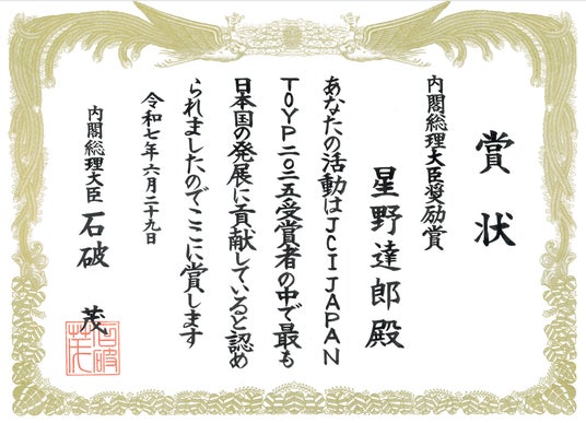 2025年6月29日(日)、株式会社NIJIN(本社:東京都江東区)代表の星野達郎が、青年版国民栄誉賞と称される「JCI JAPAN TOYP 2025(The Outstanding Young Persons)」にて、最高位であるグランプリ(内閣総理大臣奨励賞)を受賞し、東京都内で行われた授賞式に出席しました。