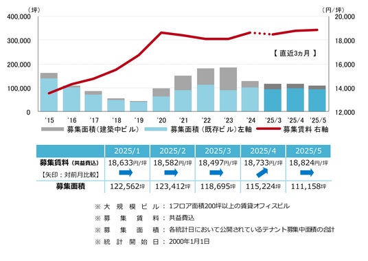 募集賃料は前月比プラス91円/坪の18,824円/坪となった。前月から小幅な動きに止まり、募集賃料は18,000円/坪台後半で推移している。