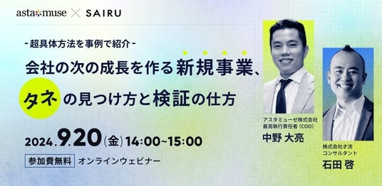 アスタミューゼ株式会社(本社:東京都千代田区、代表取締役社長 永井歩)は、2024年9月20日(金)14:00-15:00に、株式会社才流(本社:東京都千代田区、代表取締役:栗原 康太)と共同で、新規事業担当者に向けた無料ウェビナー「~超具体方法を事例で紹介~ 会社の次の成長を作る新規事業、タネの見つけ方と検証の仕方」を開催いたします。