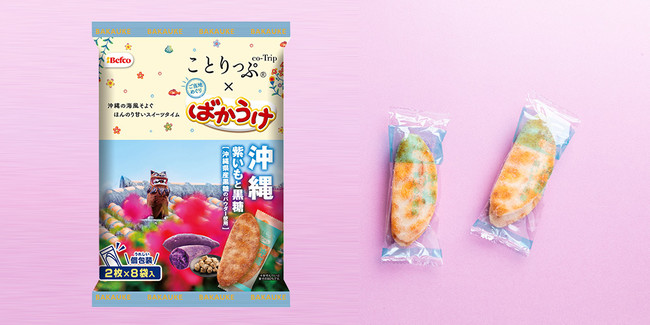 紫いもと黒糖の甘さがほんのり口の中に広がる、スイーツ感覚でお楽しみいただけるばかうけです。味付けには沖縄県産黒糖のパウダー使用。パッケージは『ことりっぷ 沖縄』の表紙柄を採用しています。