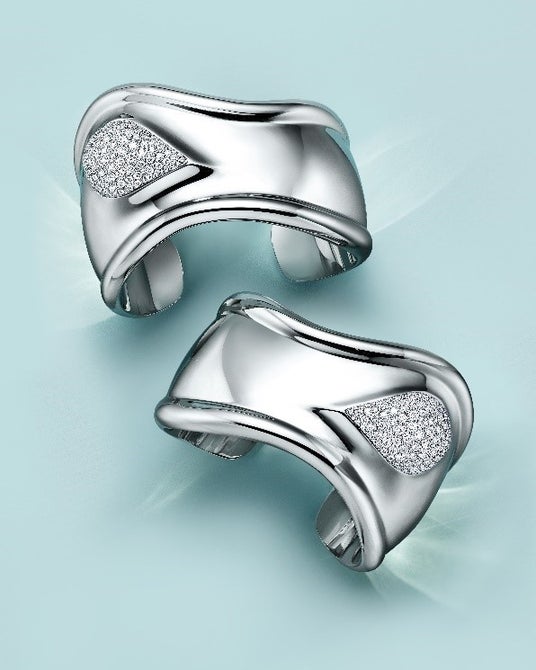 プラチナ製のボーン カフは、ペレッティの代表作であるティアドロップのデザインを模した有機的な曲線に、100石以上のダイヤモンドを手作業でセットした真の傑作です。