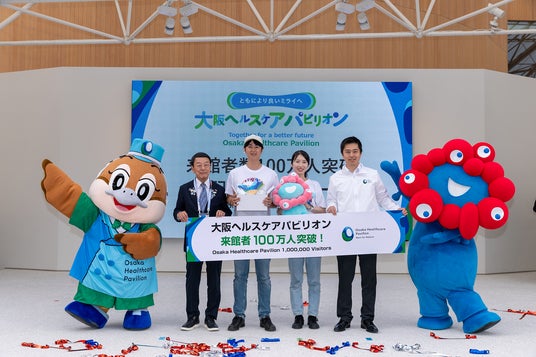 大阪府と大阪市などが出展する大阪ヘルスケアパビリオンは、REBORNをテーマに、25年後の自分(アバター)と一緒にミライのヘルスケアやミライの都市の体験を楽しむ「リボーン体験」などを展示しています。開幕以来、人気のパビリオンのひとつに数えられています。2025年5月28日(水)に予想を上回るペースで来館者数100万人を達成しました。これにともない、リボーンステージでは記念セレモニーが開催されました。