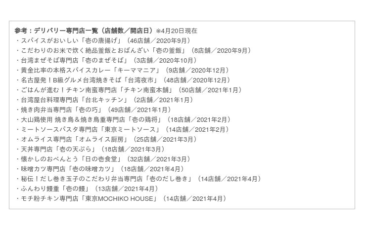 当社は、昨年9月に唐揚げ専門店「壱の唐揚げ」をオープンして以来、デリバリー専門店を順次増やしてまいりました。今後も既存店舗の厨房を有効活用し、お客さまのニーズに合わせたサービスを提供することで、新規顧客の開拓に努めます。