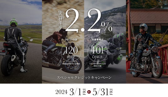 株式会社カワサキモータースジャパン(本社:兵庫県明石市、代表取締役社長:桐野 英子)が展開するカワサキプラザネットワークでは、2024年3月1日(金)より、カワサキプラザで対象の401cc以上モーターサイクル新車をご購入時に実質年利2.2%でご利用いただける「カワサキプラザ スペシャルクレジットキャンペーン」を実施いたします。