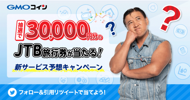 2023年4月にGMOコインが提供を予定している新サービスを予想してJTB旅行券を当てよう!GMOコインの公式Twitterアカウントをフォローして、対象ツイートを引用リツイートして新サービスの予想をした方の中から、抽選で3名様に3万円分のJTB旅行券をプレゼントいたします。予想した新サービスの内容が当たっていなくても、予想するだけでキャンペーンの対象になります。