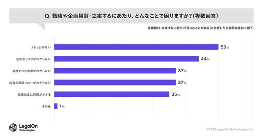 ・「戦略や企画検討・立案するにあたり、困ったことがある」と回答した事業部の企画担当者は6割超。具体的に困ったことは「ナレッジがない」(50%)、「法的なリスクがわからない」(44%)といった知識不足による回答が上位に。