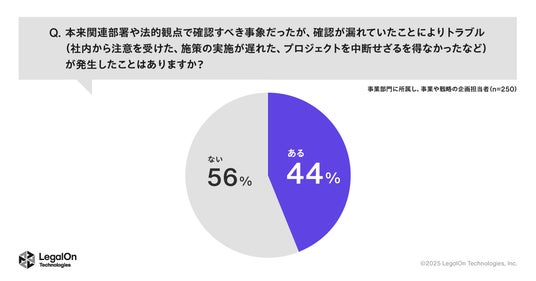 ・44%が法的観点で確認すべき事象について、確認を怠ったことで「トラブルが発生した」と回答。