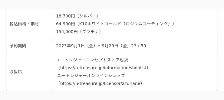 株式会社ユートレジャー(本社:東京都豊島区、代表取締役:伊藤 崇史)は、スマートフォン向けゲームアプリ「アズールレーン」とのコラボレーションアイテム「モチーフリング(指輪)」全3種類を、2023年9月1日(金)~9月29日(金)の期間限定で、ユートレジャーコンセプトストア池袋、ユートレジャーオンラインショップにて予約受付を行います。
