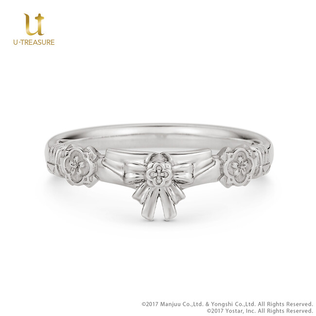リングという小さな世界に、襟元と襟元のリボンを、中央にあしらわれた花のモチーフまで細やかにデザインしました。