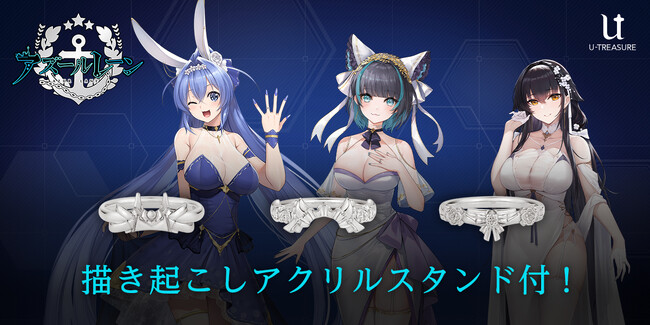 このたびの新作は、ユニオン所属ブラックドラゴンこと戦艦「ニュージャージー」、ロイヤル所属 重巡洋艦「チェシャー」、重桜所属 超甲巡「吾妻(あづま)」3名それぞれの衣装の装飾やイメージを表現しており、キャラクターをより身近に感じていただけるリング(指輪)です。
